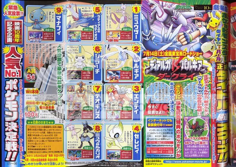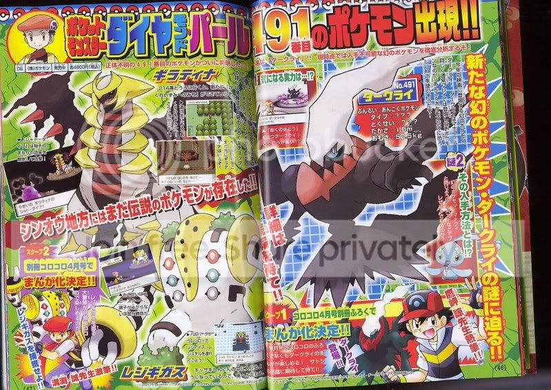 Agradecemos a la página Web Imawaka por los scans. No se que piensen ustedes, pero no me gusto mucho que Darkrai sea el tercer legendario en la cinta, hubiera preferido a Giradinas, pero en fin, me mataron la ilusión de un nuevo Pokémon.