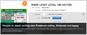 En los últimos cinco meses, algunos japoneses tramposones, han obtenido Pokémon raros en sus juegos tales como Shinies y Legendarios, se desconoce si haya sido legal o ilegalmente. Algunos de éstos hombres con visión para los negocios, ya están usando el sitio japonés de Yahoo para vender Acciones: Yahoo! Actions para así lucrar con sus monstruos de bolsillo, obviamente Nintendo no está nada contento con lo ocurrido.